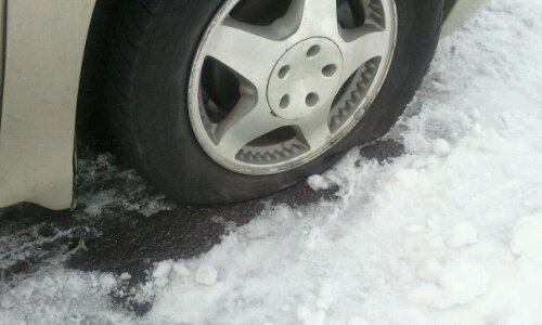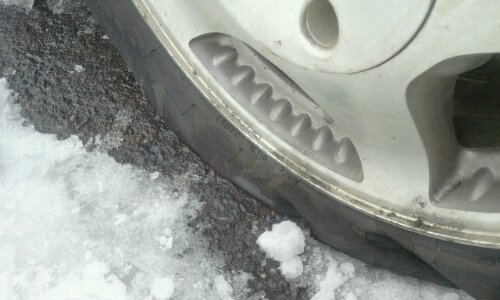 So last night I left to go pick up Gavin and Lizze's meds. Driving down the road I noticed the van pulling sharply to the right. I figured it must be the snow on the road and didn't think much of it. However, it was still pulling when I hit the main roads. I pulled over and got out to look and sure enough I was driving on the rim.