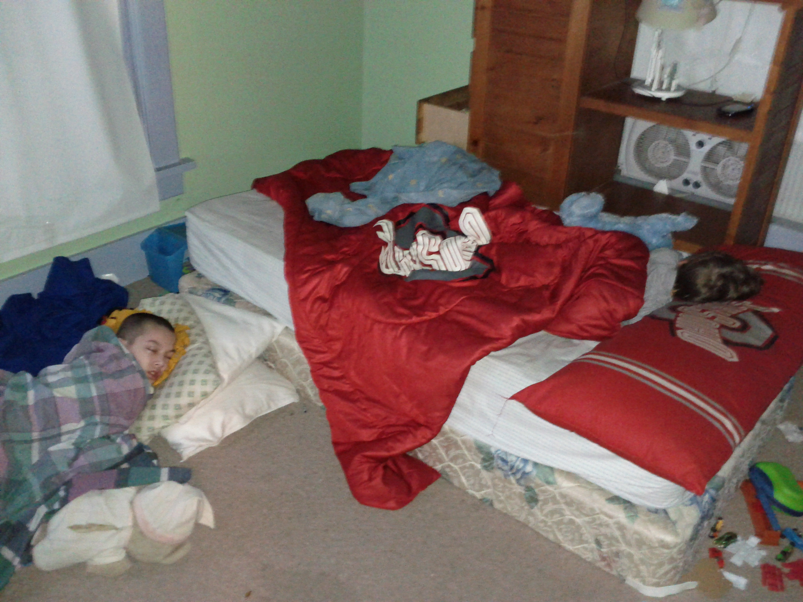 The boys wanted to have a sleep over tonight. Gavin camps out on the floor in Elliott's room and the fall asleep watching movies.