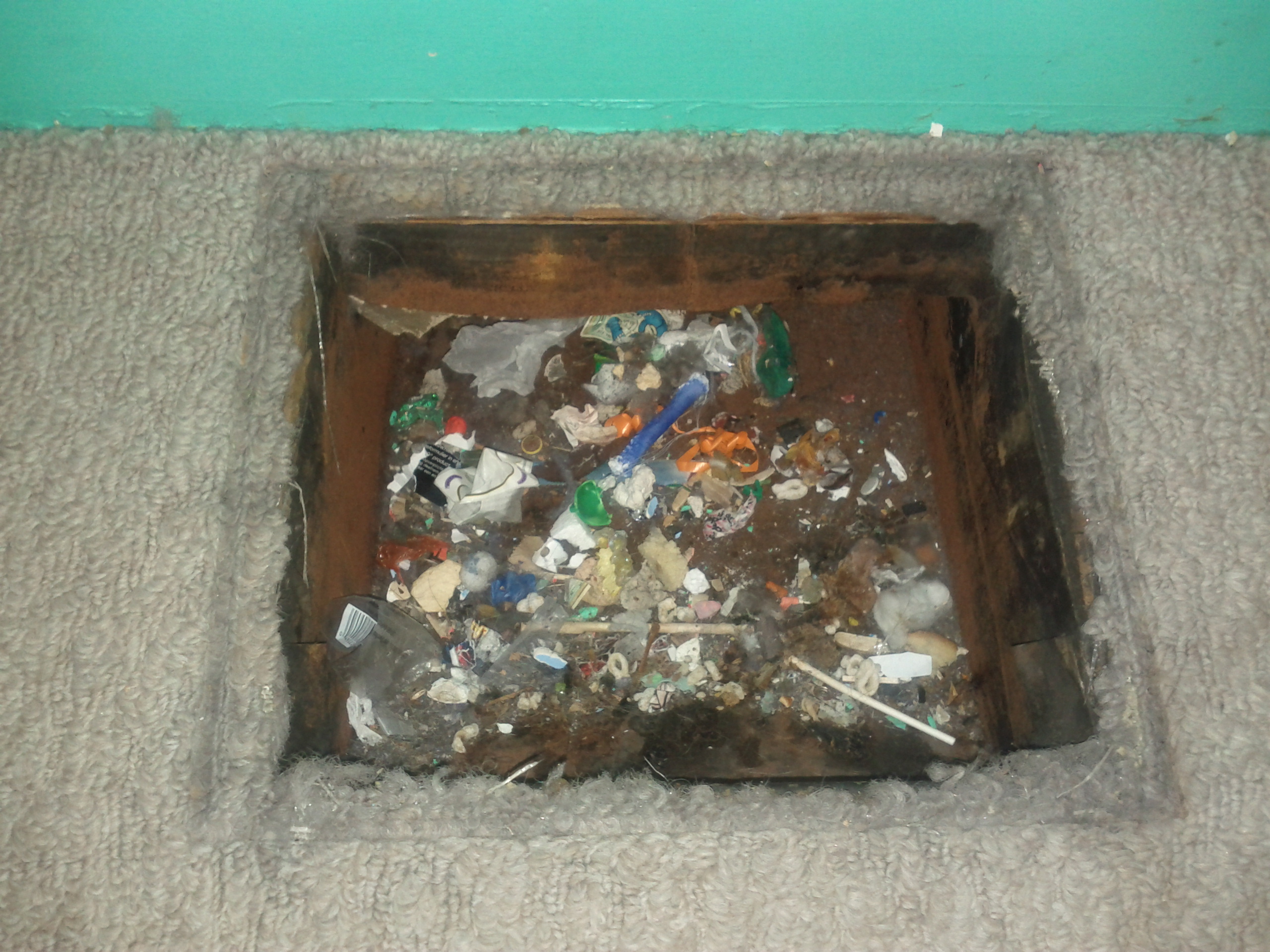 I'm not sure I would call this hoarding but it's pretty close. I was cleaning out the registers today when I came upon this in Gavin's room. He has apparently been.....collecting....trinkets and trash for a while now. If you think that was the big surprise, you'd be sorely mistaken. The biggest surprise was discovering that Gavin had been using the register as a urinal.