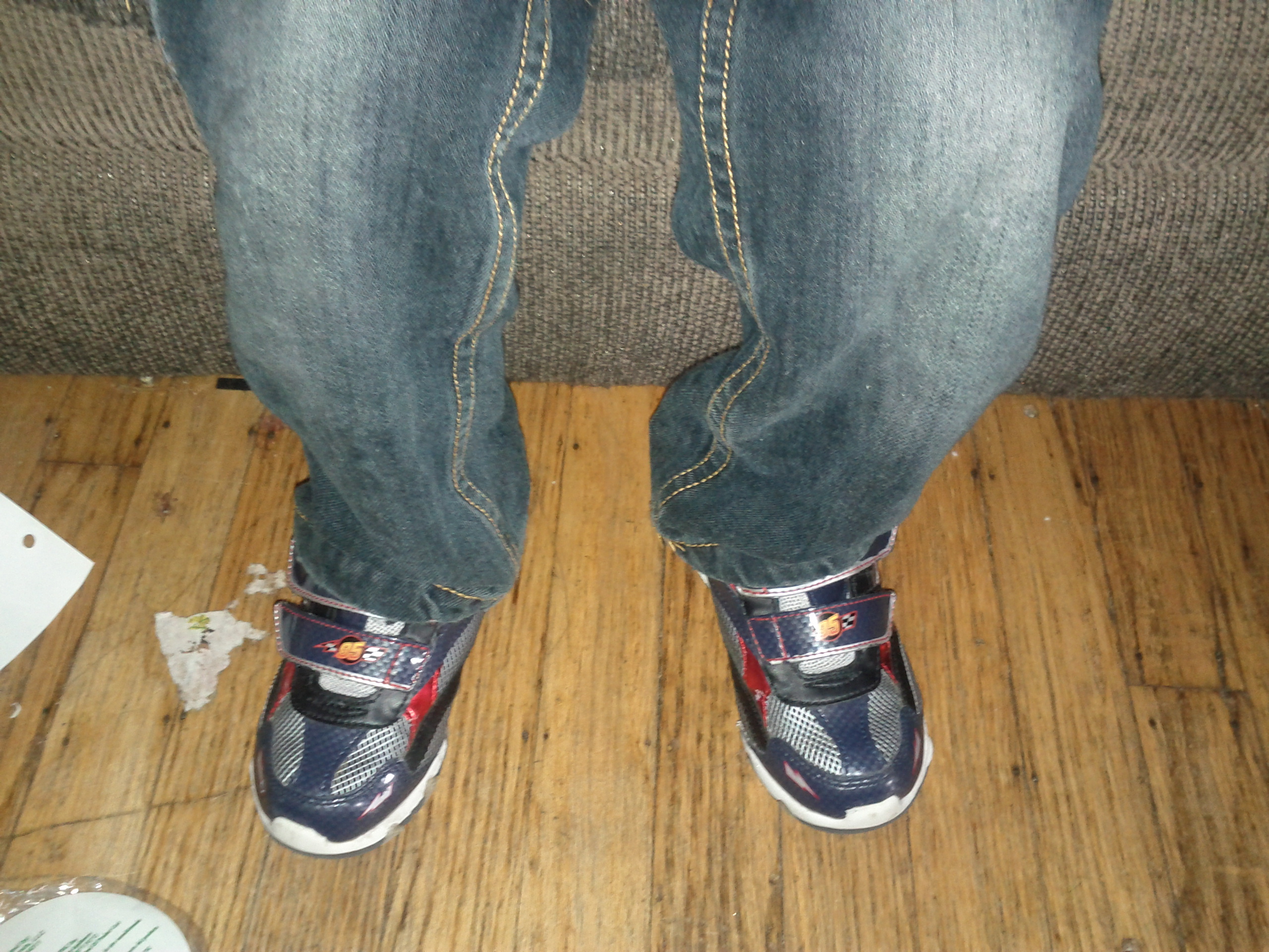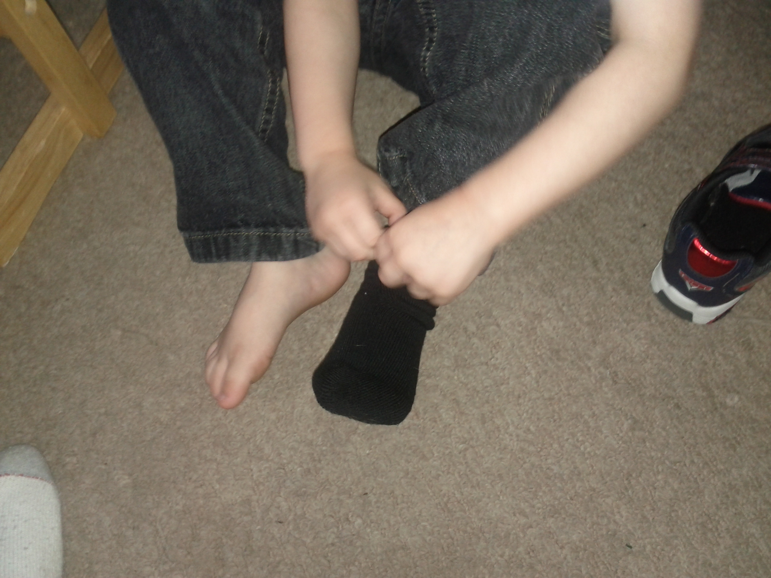 I asked him if he could go put the other one on? He said "yes Daddy". He ran downstairs and comes back with his shoe on. Then he went downstairs and came back up with the other sock and shoe on.