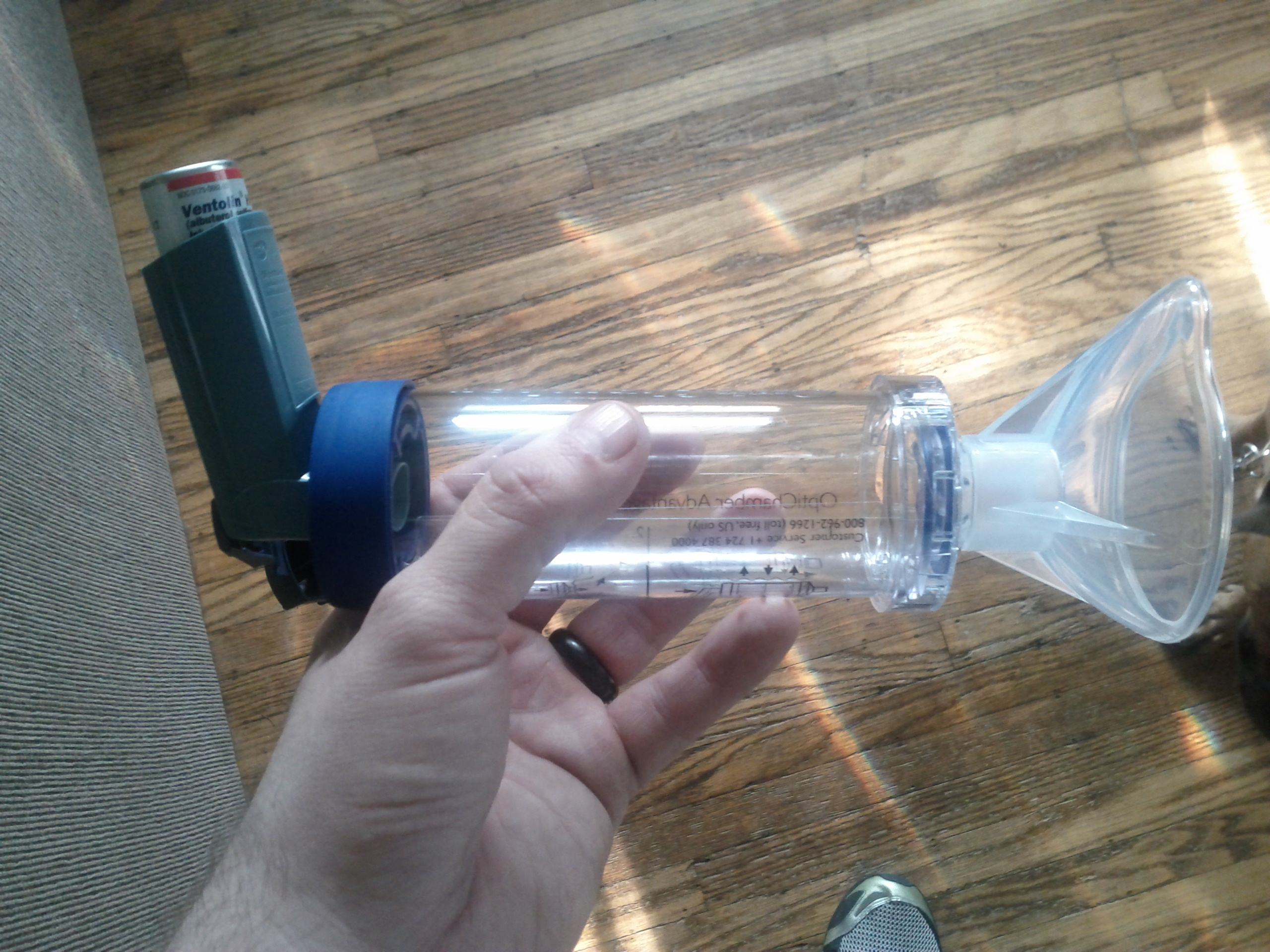Basically I release medicine from the inhaler into the chamber thingy ans Gavin inhales deeply through the mask. He has to take two hits (another technical term) every four hours. So far it seems to be helping. He says he can breathe easier, so that's a good thing.