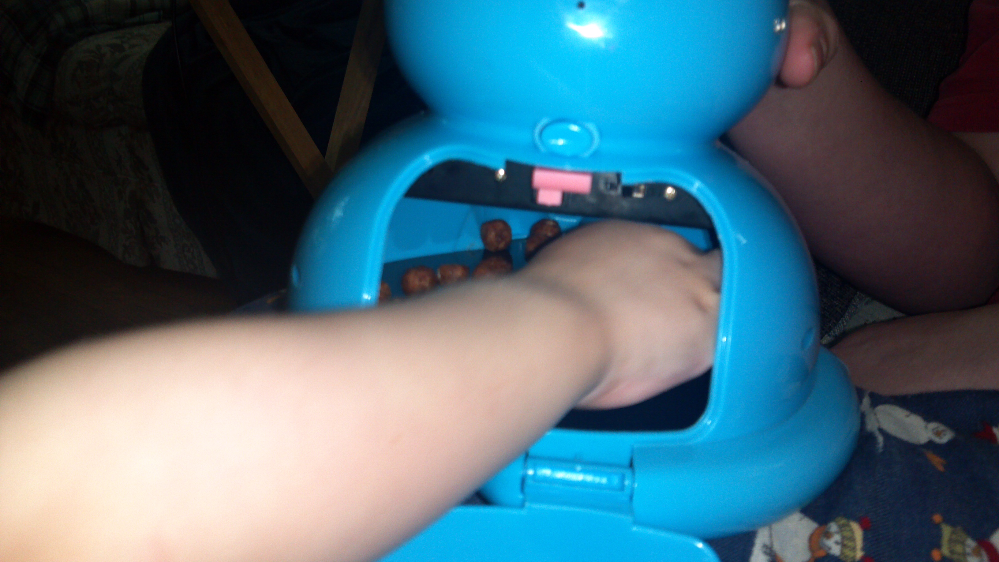 So all afternoon, Emmett was reaching his hand into the cat bank's butt and pulling out coco puffs. Then he would eat them but only after thanking the cat for "pooping chocolate cereal".