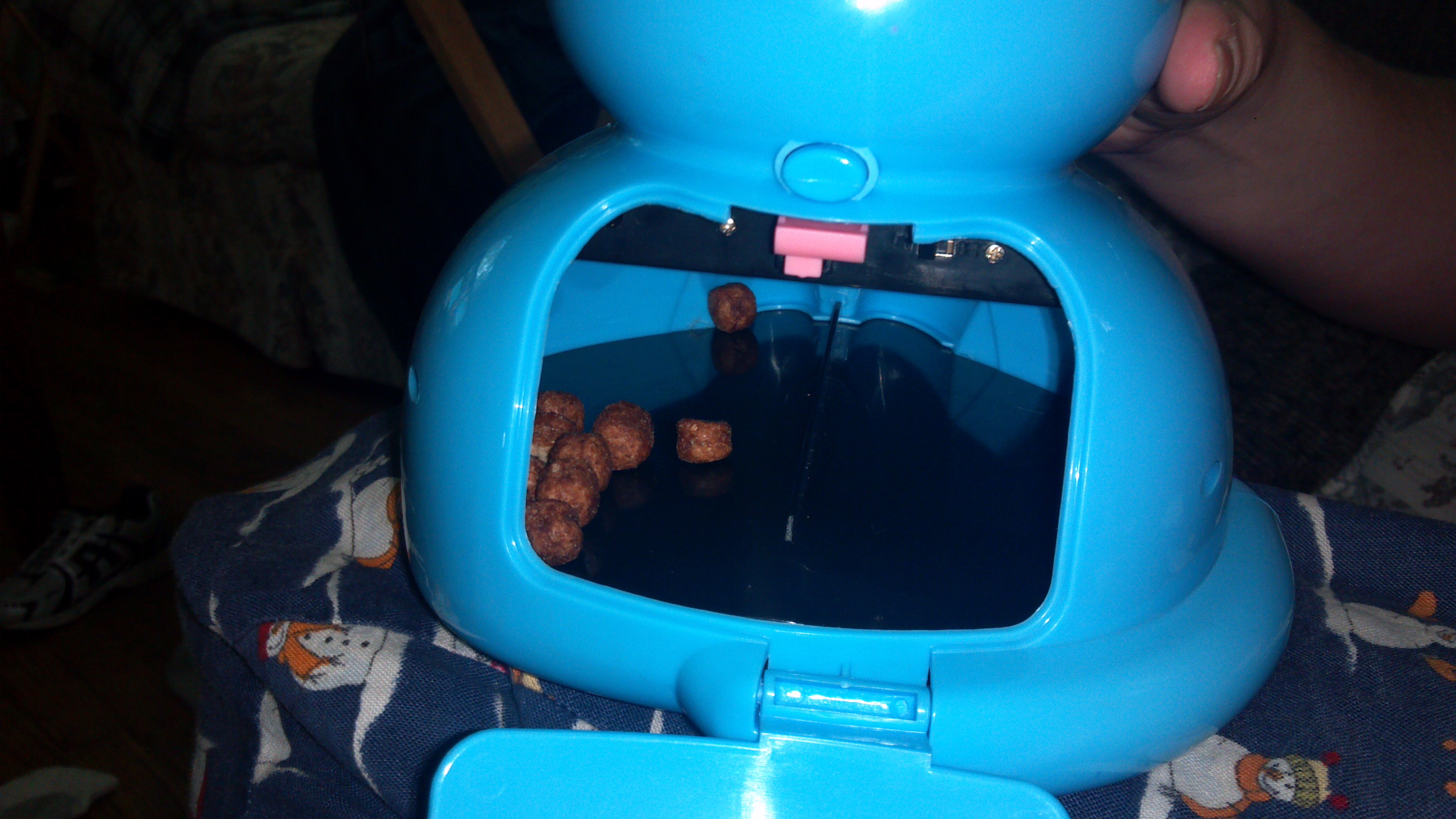 This is a bank, actually a cat bank. To get your money out you push a button on it's back and its butt pops open and grants you access to your money. In typical Emmett fashion, he decided to store his cereal inside the cat bank, instead of using it for money.