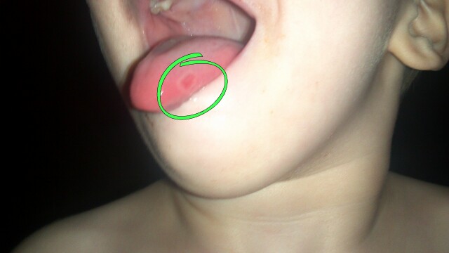 So I was able to get a picture of just one of the many cold soars Emmett is dealing with right now. This is actually a smaller one. I got the pictures so we could gauge the progress and recovery.