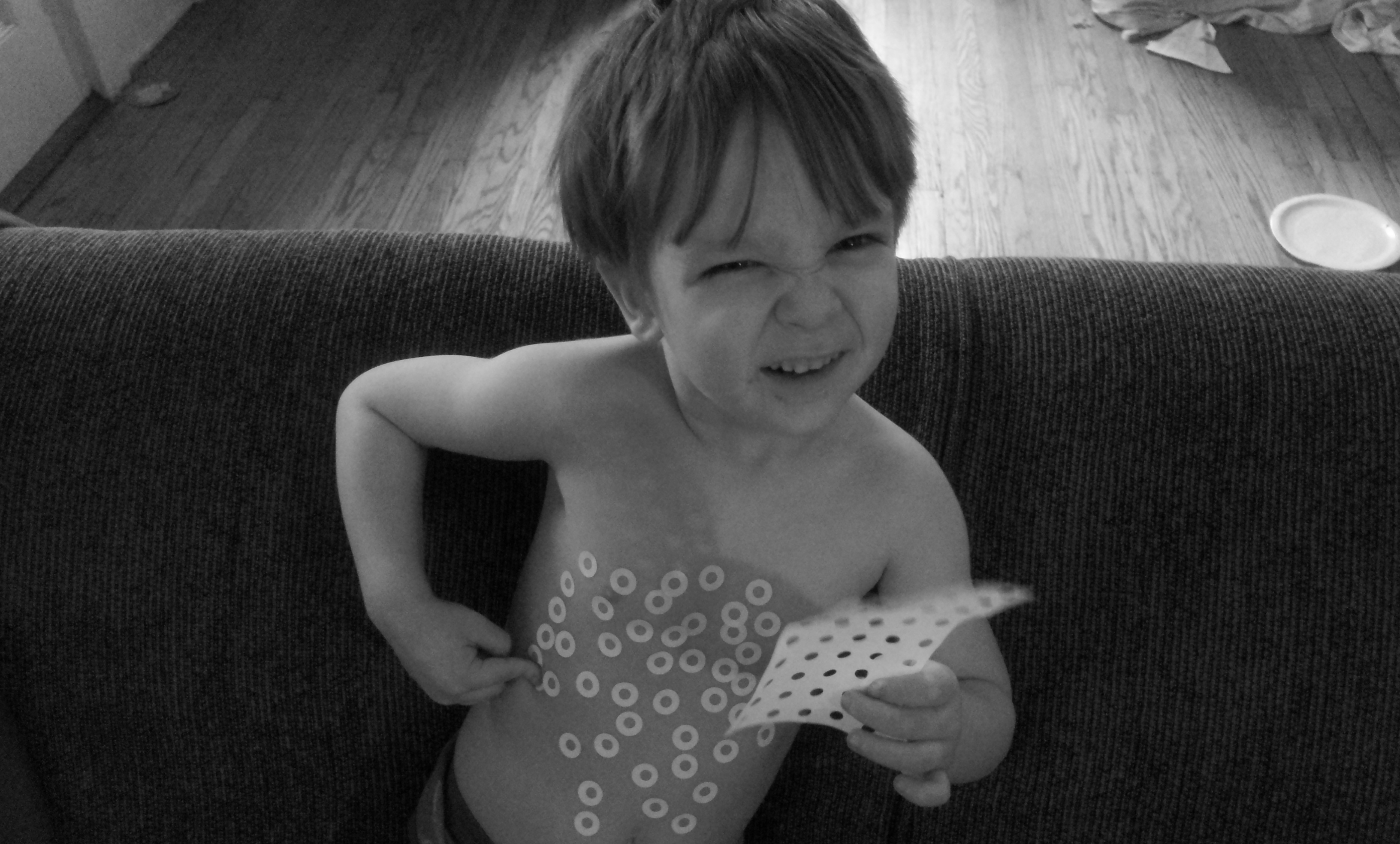 This was taken as Emmett was caught putting *hole protectors *all over his chest and tummy. He was simply to cute.