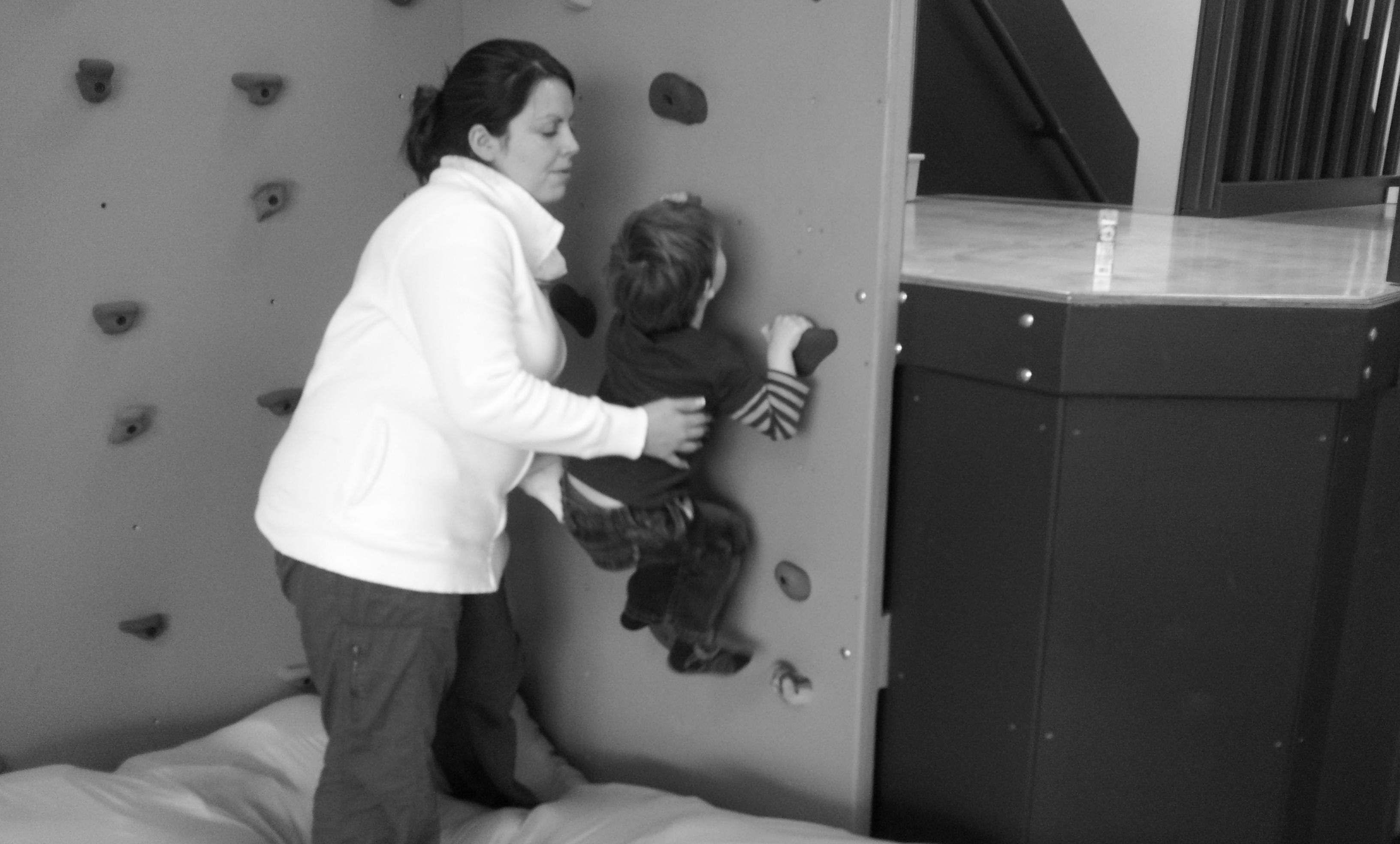 Emmett did some very cool things this week in OT. He climbed the *rock wall* and *superman jumped *off the platform and *crashed* into the giant pillows. He also did the *washing machine* as well.