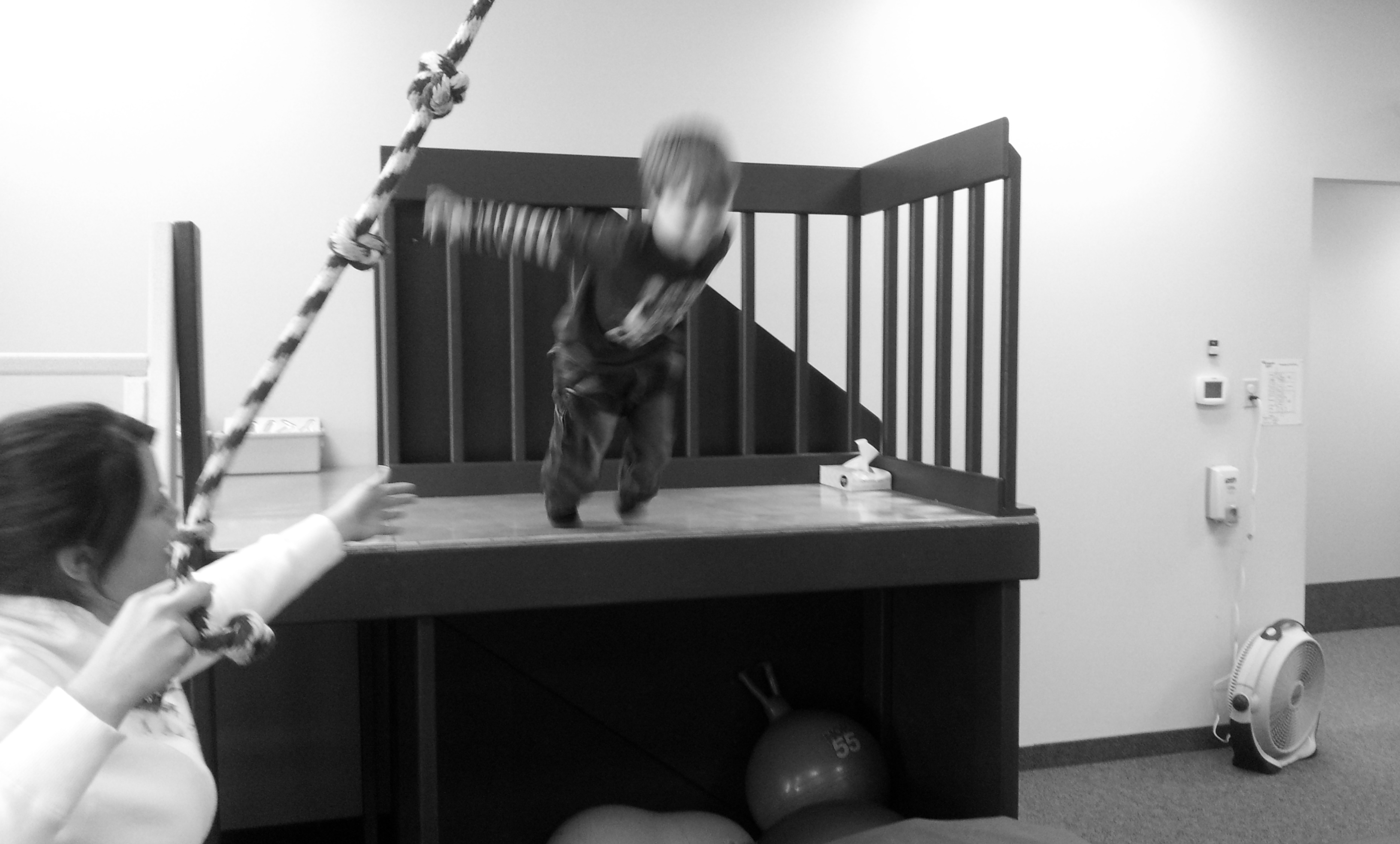 The *rock wall* was for strengthening and the *superman jump* provided the impact type input that he needs. However, the coolest thing was the *washing **machine*. They filled a giant cloth bag with balls from a ball pit. Then, Emmett climbed inside and they sorta shook the bag so that he was kinda tumbling in the balls. It basically, works to help desensitize him. He loved it.