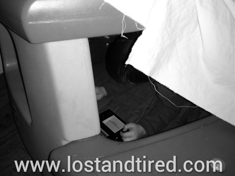 Emmett, that little stinker, had hidden himself under the kiddie picnic table. Because it was covered with a sheet I didn't see him at first.