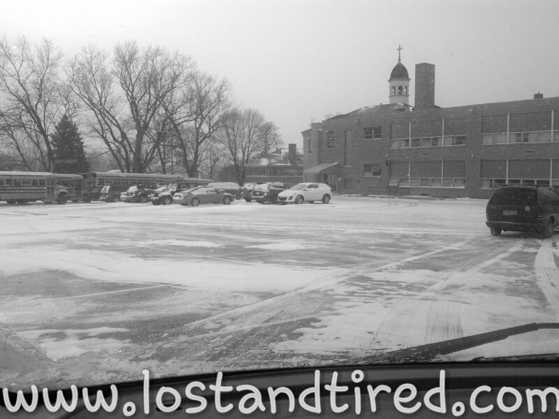 A rather extreme change in weather since this time yesterday. This the view for Emmett and I as we wait for the boys to emerge from the school at 3pm...