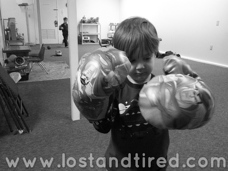 This is from last night's therapy session. Emmett was playing with these oversized boxing gloves.