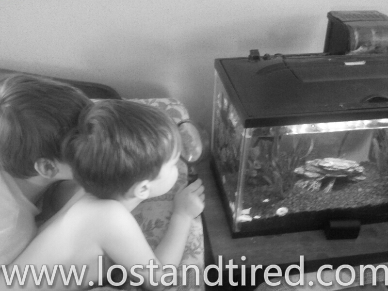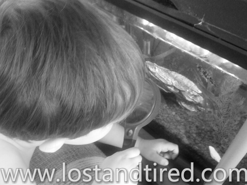 One of his most favorite things to do is look at his fish through the magnifying glass, as you can see in the pictures below.