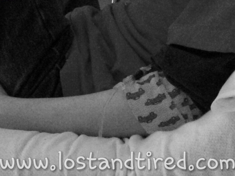Gavin began to freak out when the tale was being peeled off. It was paper tape so it wasn't bad at all. He got a bit overzealous and accidentally disconnected the IV tubing from the hub in his arm. A tiny bit of blood came out but the nurse was right on it.