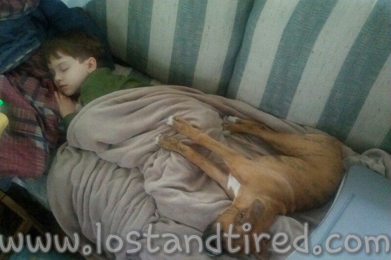 The anxious and overstimulated Elliott Richard arrived home about an hour or so later, looking very handsome. No sooner did he get home, he fell asleep on the couch. Bella took the opportunity to snuggle up to him and fall asleep as well.