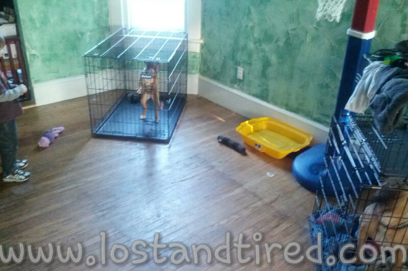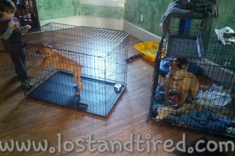 Anyway, Bella and Maggie are in separate kennels on opposite sides of the room. When we come home, a few minutes later, this is what we find.