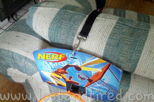Emmett was playing with a *Nerf *basketball hoop. We were using stick tack to hang it up on the front door.