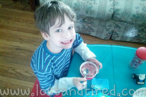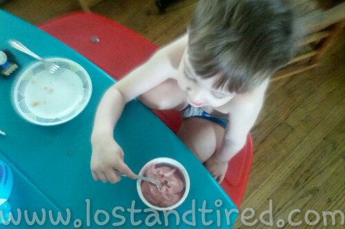 As my kids are sensitive to colors, they can make their own color by adding different fruits to the mix. For example, if they mix strawberries in, they will have pink ice cream. If they want purple or blue, they add blackberries or blueberries.