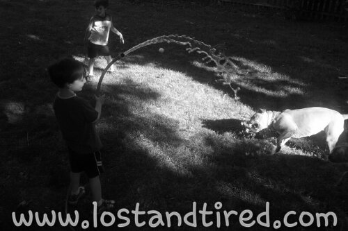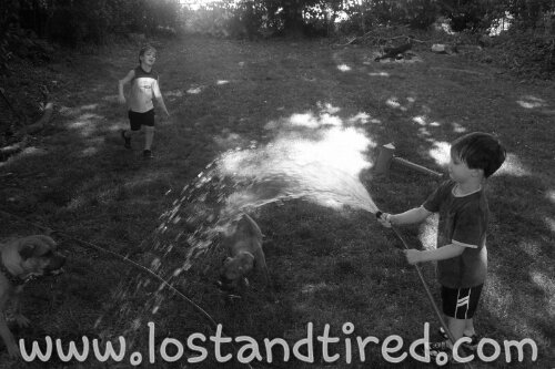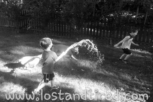 It started out by giving the dogs some water and turned into Elliott and Emmett soaking each other with the hose. Why is this a *Today’s Victory*? Simple, the boys don't usually like getting wet, especially Emmett. However, they seemed to do fine with it this evening and had a lot of fun.