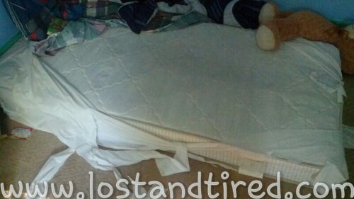 The latest issue we have had was with his mattress cover. As you can see, it's lost its effectiveness. This began during his meltdowns and the end result can be seen below.