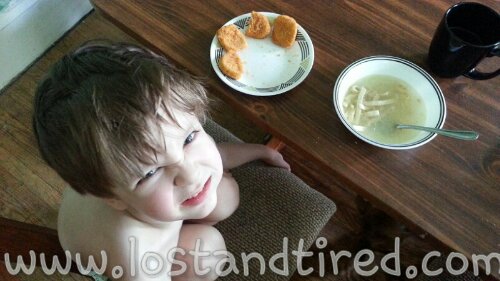 Emmett woke up from his nap and wanted to eat lunch. He ended up having a meltdown because he wanted to eat my chicken soup for lunch. My son, the one who usually freaks out because he doesn't want to eat something, was actually freaking out because he wanted to eat my homemade chicken noodle soup.