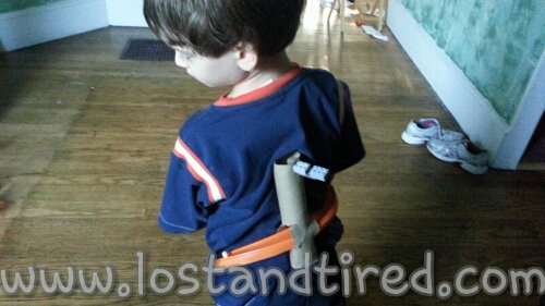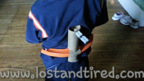 Pictured below is Elliott's latest and greatest creation, his own Flood. He made this out of a paper towel role, a piece of race track and some Lego's.
