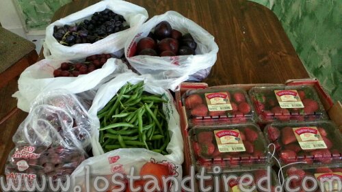 1) 2 Flats of Strawberries 2) 6 lbs of red, seedless grapes 3) 4 lbs of black or purple seedless grapes 4) 2 lbs of fresh green beans 5) 10 lbs of fresh peaches 6) 10 lbs of fresh plums 7) 4 lbs of bananas (for freezing) 8) 6 lbs of large blackberries