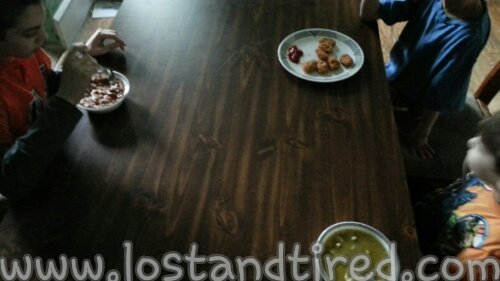 This is a typical meal at the *Lost and Tired *house. Granted we haven't put out the fruit, drinks and veggies but you can see that everyone has something different.
