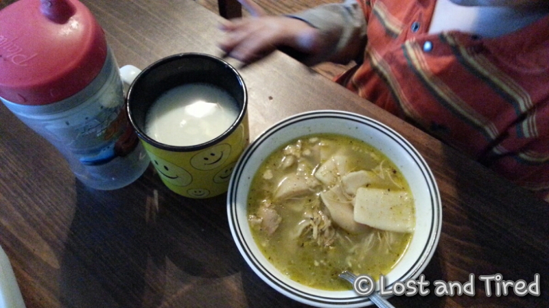 This is what Emmett had for dinner last night. A bowl of my super awesome and veggie packed, chicken noodle soup. Notice the glass of regular milk? That's right, regular milk.