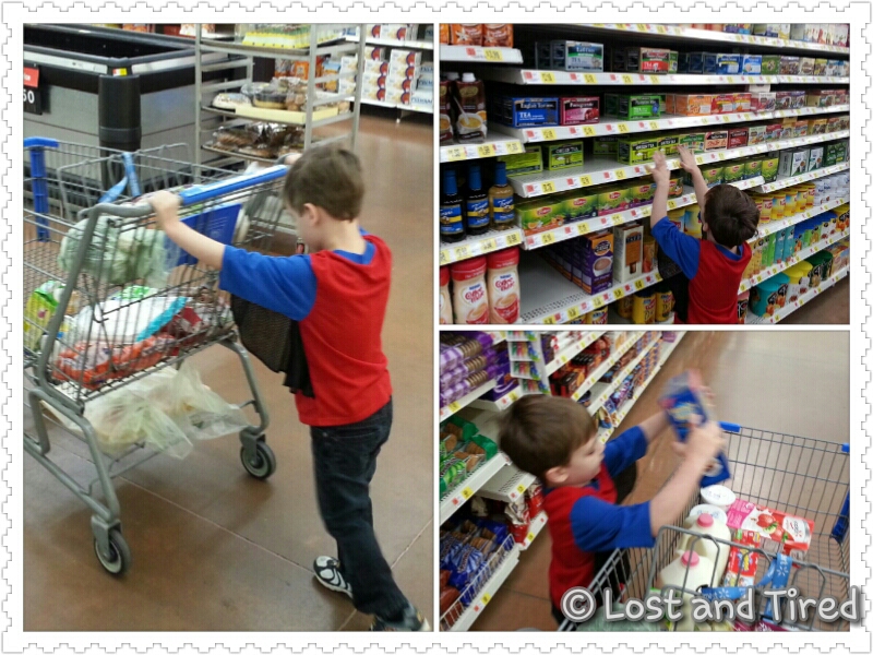At the grocery store, he helped by pushing the cart and loading items into the cart.