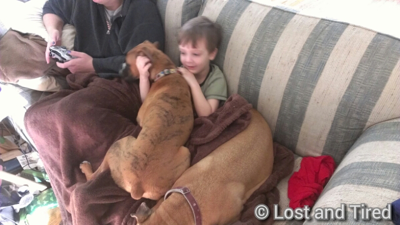 Emmett is in a relatively good mood this morning, especially for being sick. He's snuggled up with his favorite boxer and English staffy.