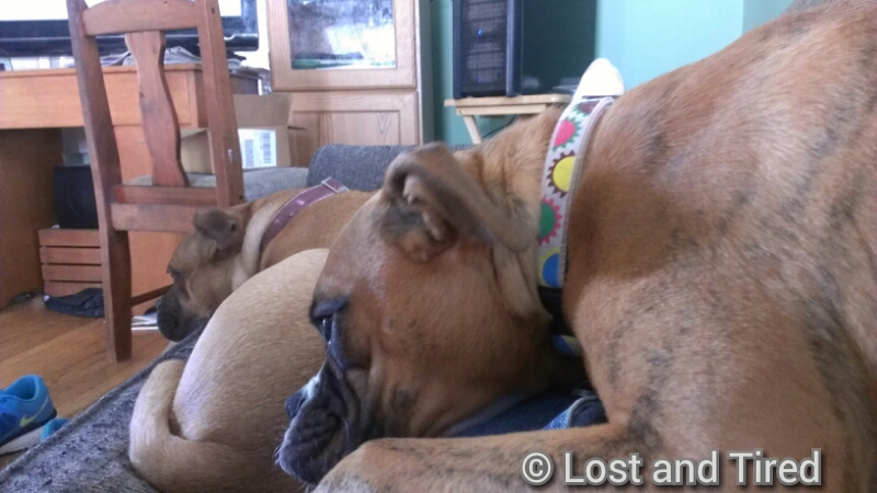 Maggies laying across my legs and Bella is laying across my waist. They're sorta like a 125 lbs of weighted blanket.