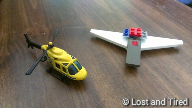 I have been playing *ships* with Emmett for about an hour now. He's using this toy helicopter and I get to use this amazing creation that he built, just for me.