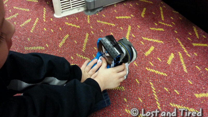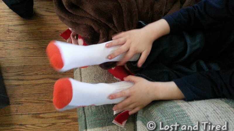 When we arrived home, he even tried a pair of the tube socks on and wore them for most of the day.