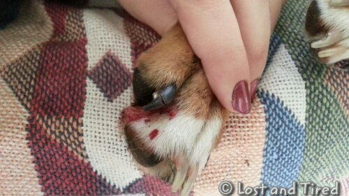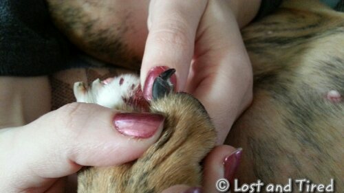 Last time, the Vet was able to just snip the nail back. This time, she broke it in such a way that it's broken at the top and the cracked runs backwards, right into her toe, hence all the blood.