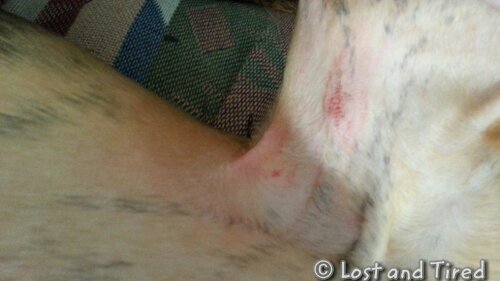 We also noticed what appears to be a rash and a bunch of scratches, all over her underside. Perhaps she's allergic to something or she messed herself up, tussling with Maggie outside this morning?