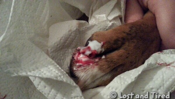 We packed her broken nail with flour to stop the bleeding and cleaned her up. I added some antiseptic and wrapped her foot up. She is also sporting the cone of shame tonight, just in case.