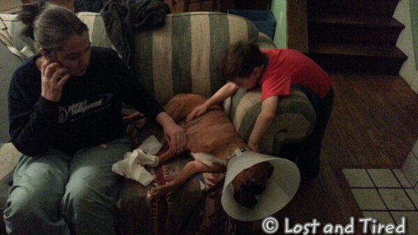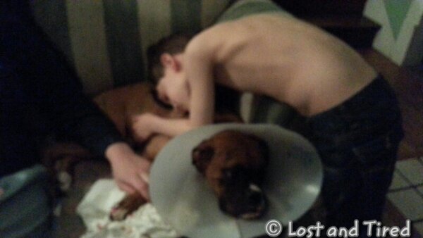 Unfortunately, without thinking, I let the dogs out and Bella broke the same nail even more. She came in the house and left a trail of blood everywhere. This time however, the boys were home to experience this.