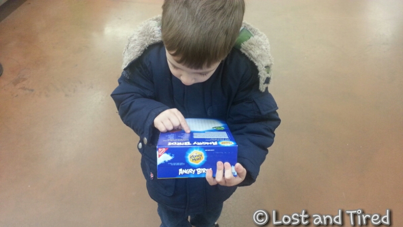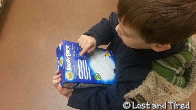 Emmett is a very careful shopper. He reads the back of the box to learn what's in the food he's eating.