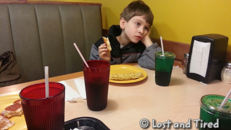 We finally got Elliott to eat. He's munched on things but not willingly. Yesterday, we decided to try him at Cici's Pizza.