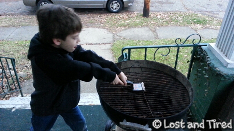 While he didn't lite the grill, he did scrape it and load it with the food. He also hung out while we waited for the coals to be ready.