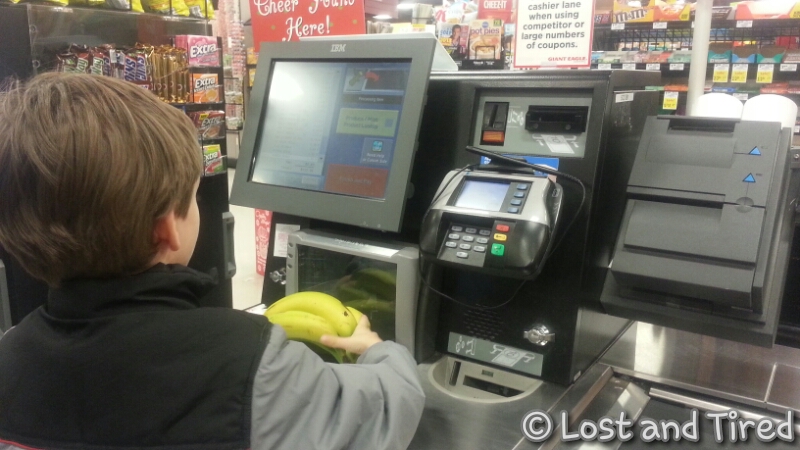 During today's trip, Elliott was ringing things out while I was bagging them up. When it came to the bananas, they have to scanned and weighed a little differently. One of the cashiers that sorta floats around making sure no one else needs help, took it upon herself to teach Elliott how to manually enter the produce.