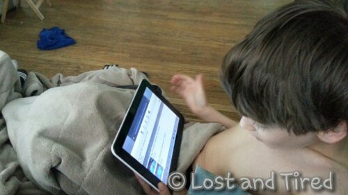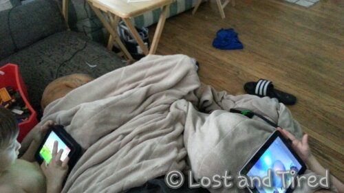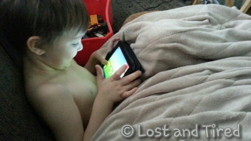 However, at about 2pm this afternoon, both boys snuggled up to me on the couch, each armed with a tablet. Elliott is watching Super Monkey Ball videos on YouTube and Emmett is counting sheep.