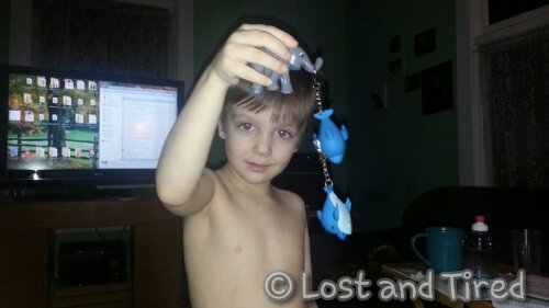 At this point he proceeded to hang his dolphin key chain on this little elephants trunk. He then took another dolphin key chain and hooked it on the first dolphin.