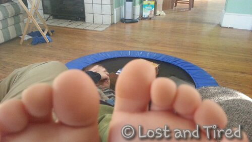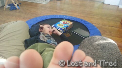 I took this picture the other day and never got around to sharing it. Emmett was laying upside down with his head on the trampoline, his feet in my face and his hands in a box of Angry Bird crackers.