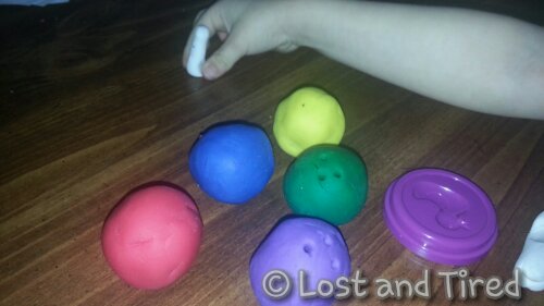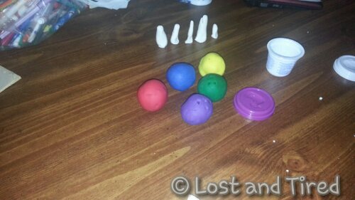 I made the round bowling balls out of Play Doh and Emmett, being the resourceful little man that he is, used an old DS stylus to make the holed for our fingers.