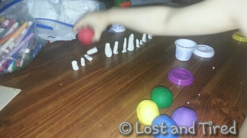 Then we made the actual pins out of white Play Doh and set them up. We played until the Play Doh needed to go back into its containers because it was drying out.