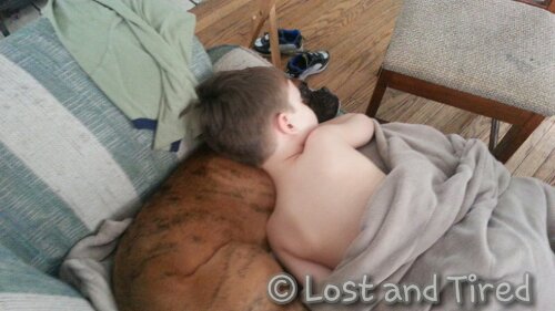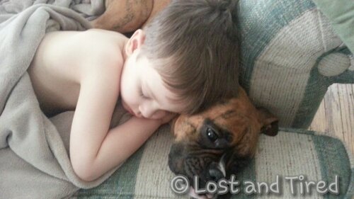 This afternoon, Emmett just wouldn't lay down for a nap. I hung out with him and had him lay down on the couch. Before his head hit the pillow, Bella was laying next to him and snuggling up to him.