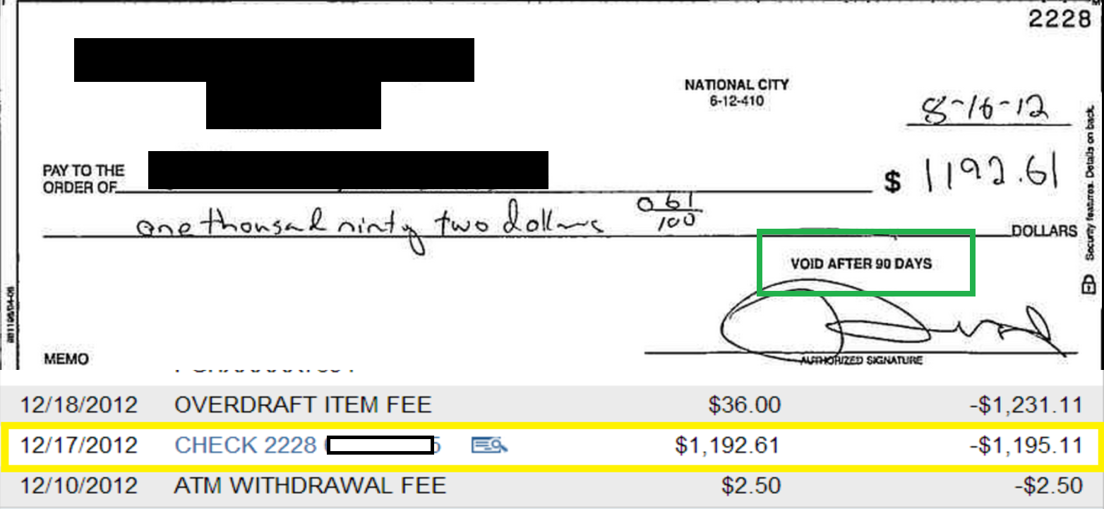 However, in December of 2012, PNC allowed an expired check to clear my account. That check was in the amount of $1,200, roughly. The balance in the account they let it clear from was only $2.43. Doing the math, you'll find that the check was about $1,197 more than what I had in my account at the time.