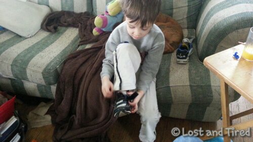 While he refused to put his own clothes on (it's just that kind of day), he did put his shoes and socks on all by himself. He even puts his shoes on the correct feet and adjusted his socks as well. Shoes and socks are Emmett's arch nemesis and he absolutely hates them most of the time.
