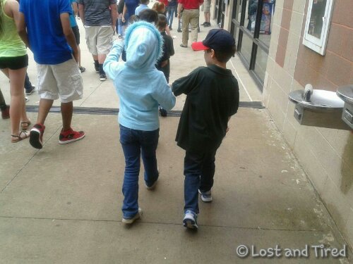 For now, I'll leave you with a picture of Elliott holding hands with a little girl in his class at the game. My Dad sent it to me. Apparently, these two are *buddies* for the game today.. :-)