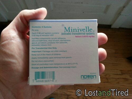 She's doing the Estradiol Transdermal patch. This is basically a low dose form of estrogen. Basically, she wears these little patches for 3.5 days before replacing g it with a new patch.